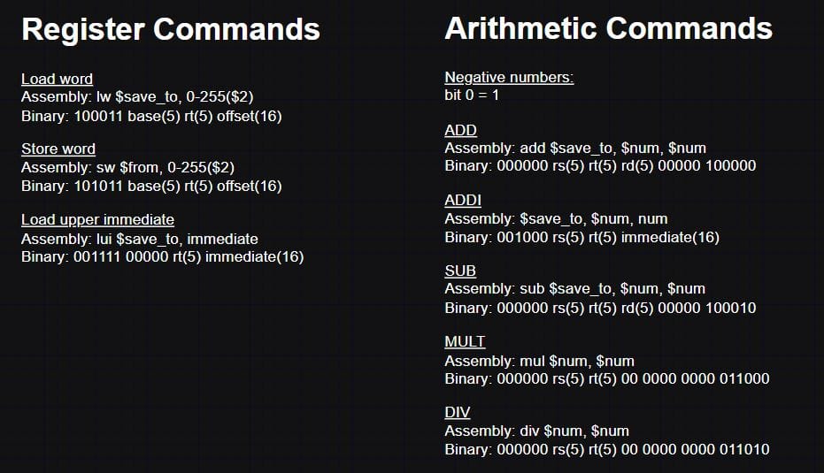I have always been excited to write some Assembly since I knew it was in the latter portion of my course. The translation of Assembly to binary was made much better by the MIPS32 guide I had access to. The things in this process that I think were most difficult, were being consistent with binary signs (positive and negative integers), remapping the Assembly instructions to the binary format of MIPS32, and keeping the binary to 32 bits when stored and processed.
