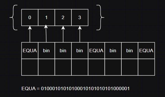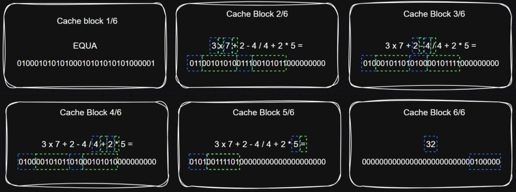 Once an equation is complete, the equation and its result are encoded into cache blocks. It took a while to decide on a safe and reliable, because the program needs to be able to determine when a number starts and a symbol begins, when numbers are preceded with a sign (1, 0) and are of an unfixed length.