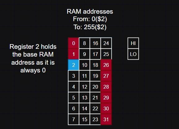 Cache blocks are 32 bits or 4 words in length. The registers contain 32 registers plus a hi and lo register for multiplication and division. I only used the lo register, though. Registers 0-1 are reserved and cannot be used, and the same goes for registers 26-31. Register 2 is reserved for RAM referencing (which I didn’t implement).