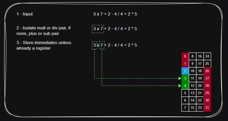 This was the easiest and least intimidating part of the project to complete. The plain English text has all of its spaces removed and each character is regex checked for illegal characters. Then, the equation is split into a list – 5×10 becomes [5, * , 10]. The order of operations is processed one instruction at a time by passing the text to the Assembly script for formatting, and passes that Assembly into the CPU for operation.