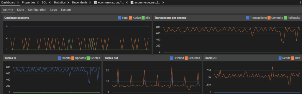 This was the first test that didn’t crash the server, I assume because the increased time to computer checks and simulate activity spread the load rather than flooding with constant inserts. Perhaps the server slowed enough that it became unlikely to crash even if this wasn’t the case, but I did notice over the testing that when transactions hit more then one table, and when load as more distributed to things other than simply bulk inserting, the server handled it much better and sometimes faster.