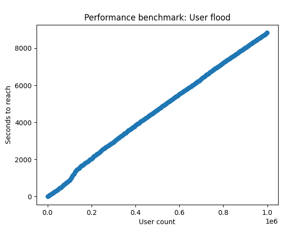 When approaching 1,000,000 users, the transaction rate slowed to around 100-150 per second.
