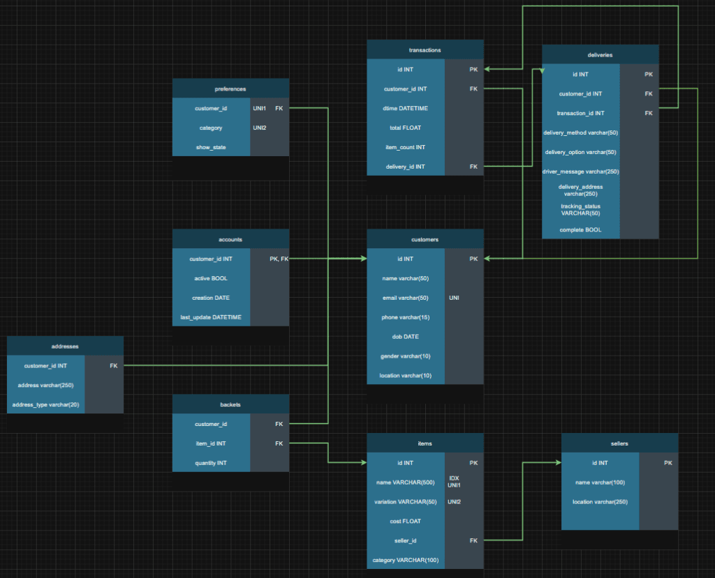For this I wanted to create a fairly intuitive system of tables that would work for an end-to-end experience of signing up to a website, through to getting a delivery. I didn’t create a user authentication table, as in this pretend business, it’s handled elsewhere.