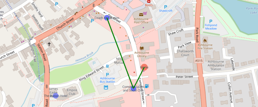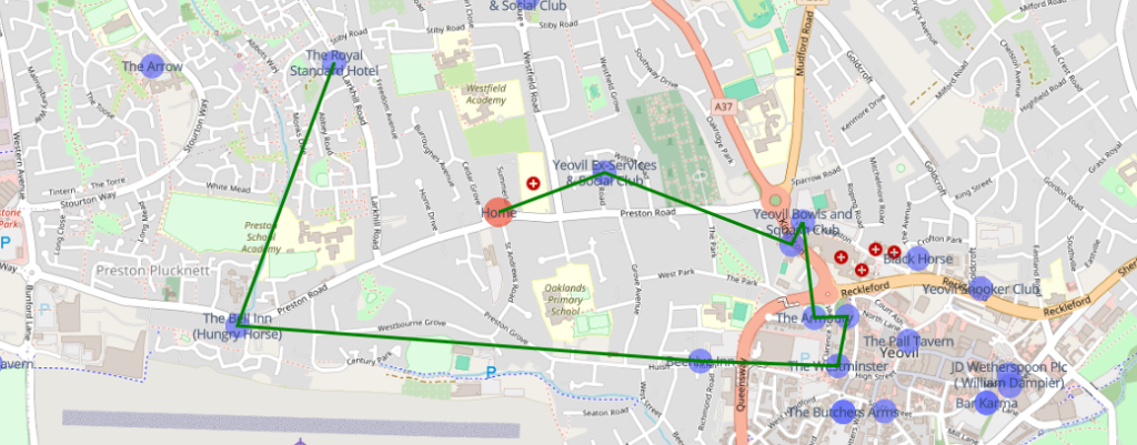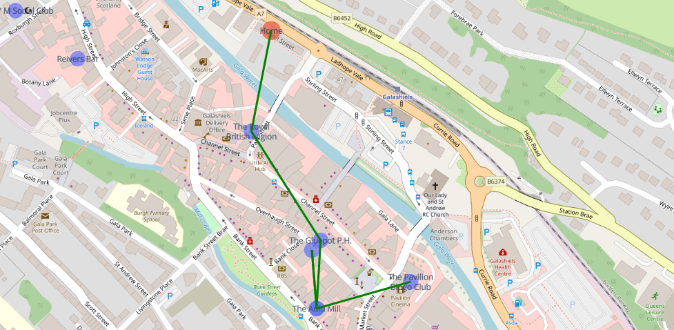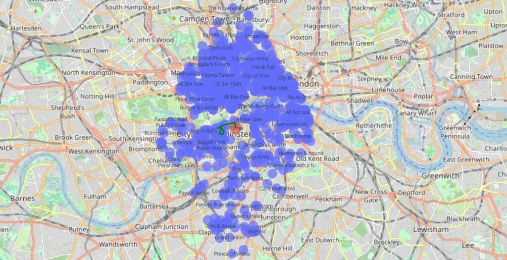 Now that, looks like a solid plan. You’ll notice that on the bottom right, there are a huge clump of pubs. In theory, the algorithm could be tweaked to predict clusters to improve path finding, but it did what it was meant to do – travel to close pubs one at a time, prioritising pubs that keep you close to where you started.