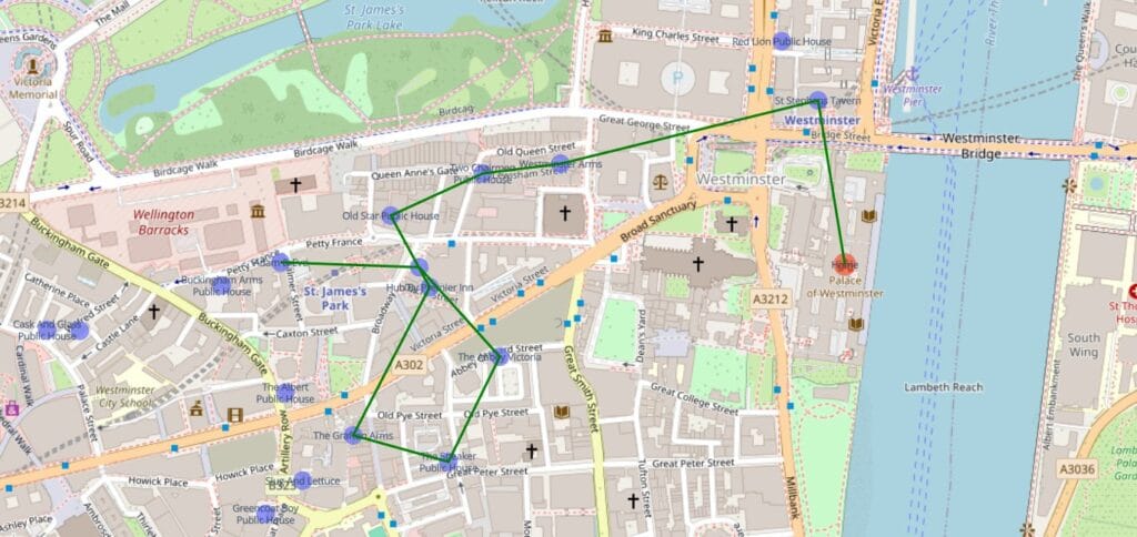 Now that the script is optimised, I will attempt something that wasn’t possible before – a pub crawl in central London. There were too many pubs and it took forever, but we’ll see how long the optimised script takes for a 10 pub crawl, starting at the houses of parliament.