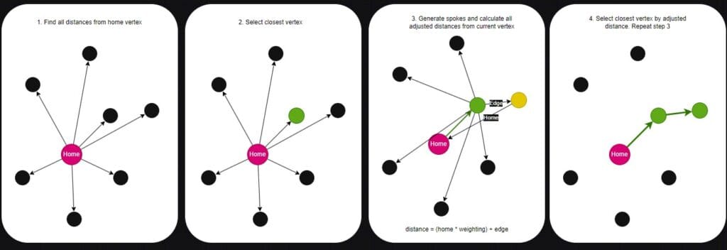 The find_closest_adjusted_node function uses a relatively simple formula. For each neighbouring vertex (neighbour) of the current vertex, providing we haven’t already visited the node, and it’s not the home nose, and the edge weight is greater than 0 (showing a distance calculation error), then we find the distance of the neighbour from the home, and add to that the edge weight from the current vertex.